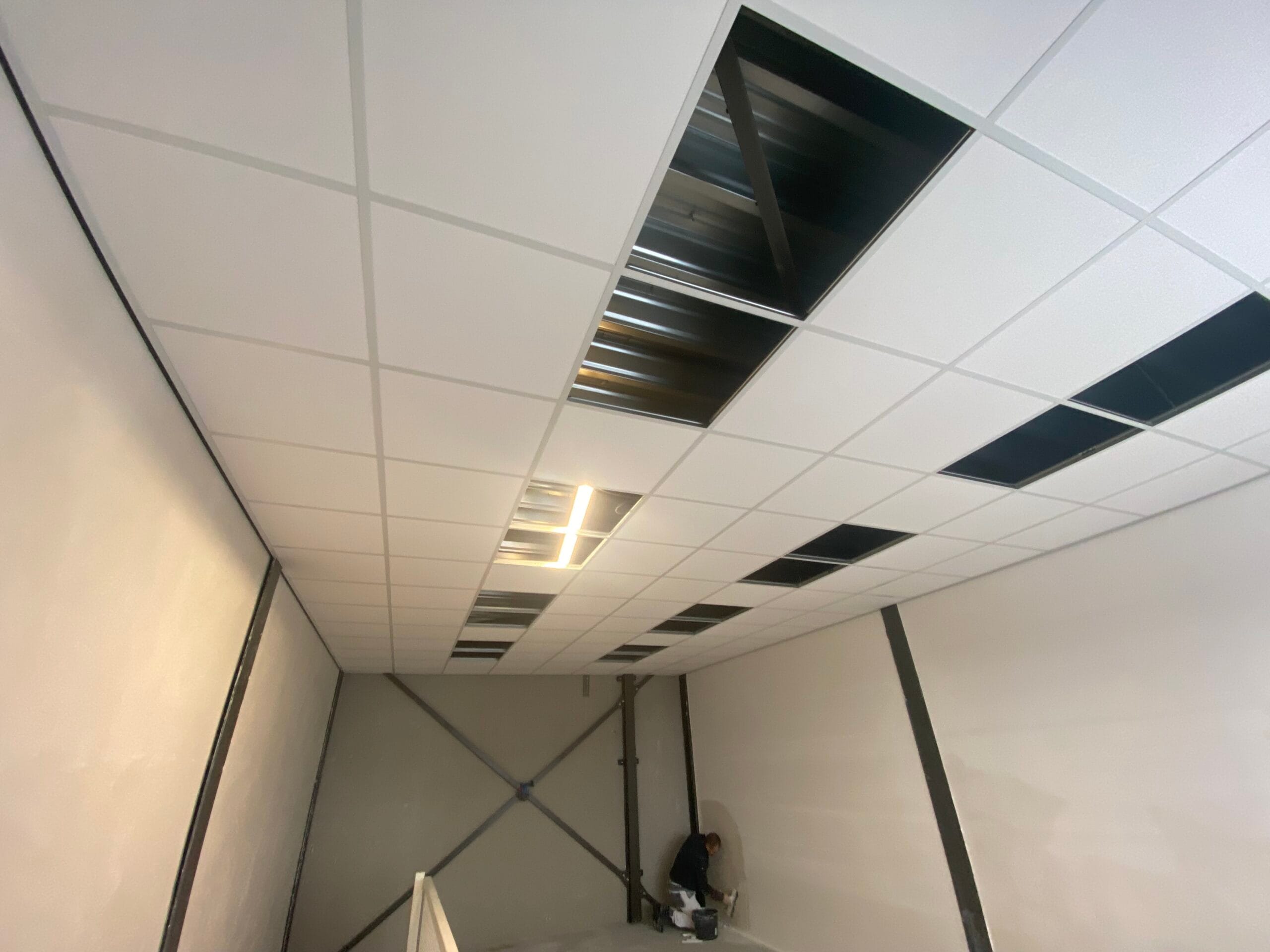 Bedrijfspand in Culemborg voorzien van de Knauf Topiq Alpha 15 60x60cm inleg. De gaten zijn bedoeld voor led panelen en infrarood verwarming.