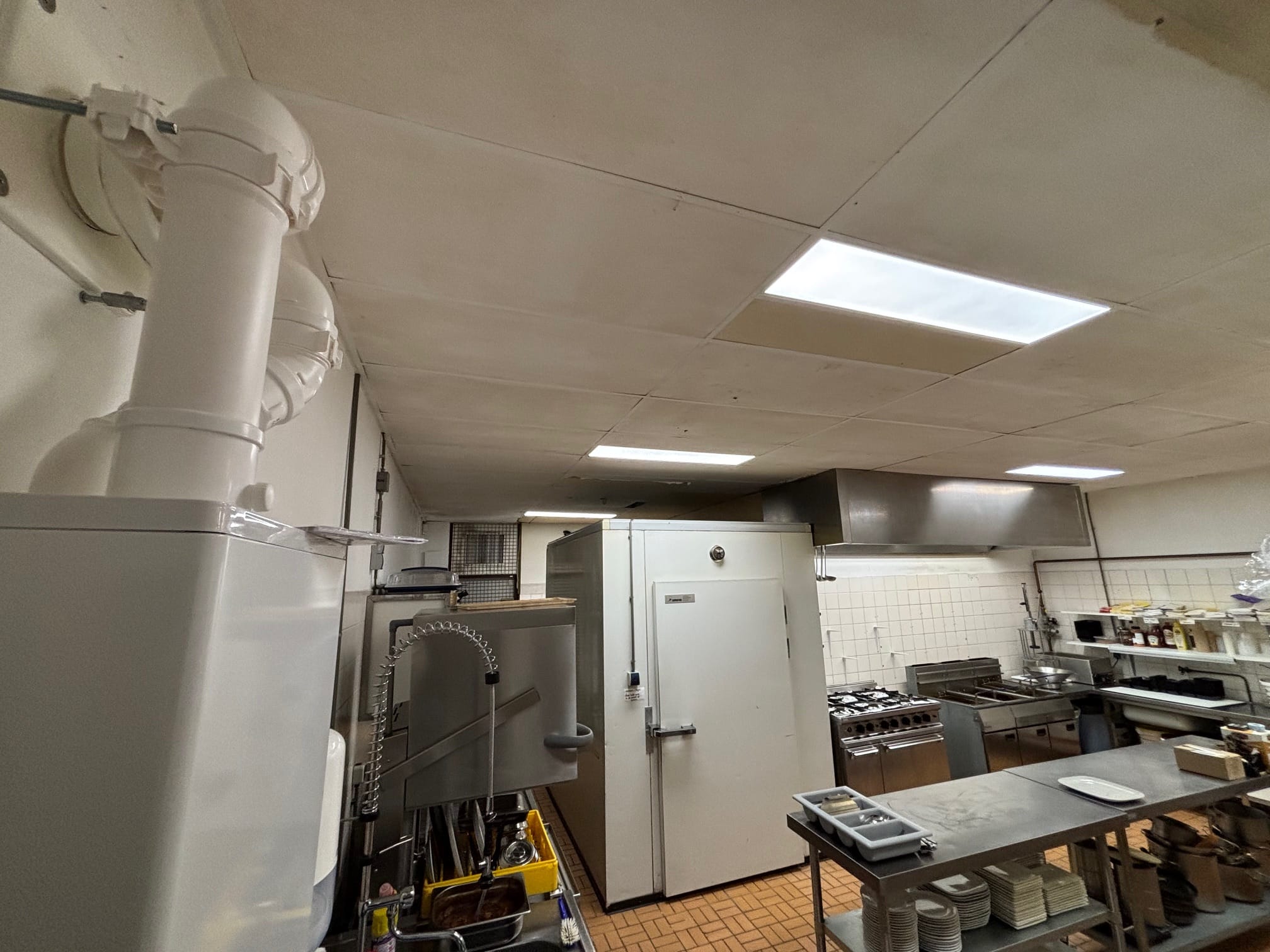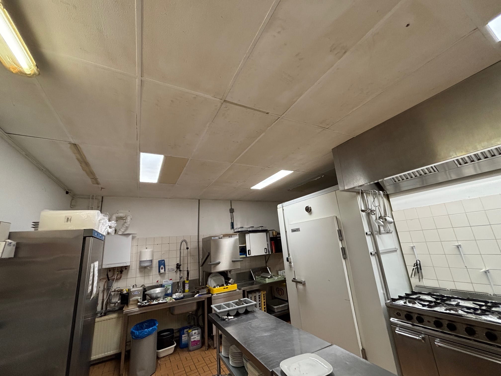 De horeca keuken van het cafe in het multifunctioneel centrum te Aduard was nodig aan vervanging toe. Gekozen is voor gips vinyl 60x120cm, welke HACCP geschikt en kan schoon gemaakt worden.